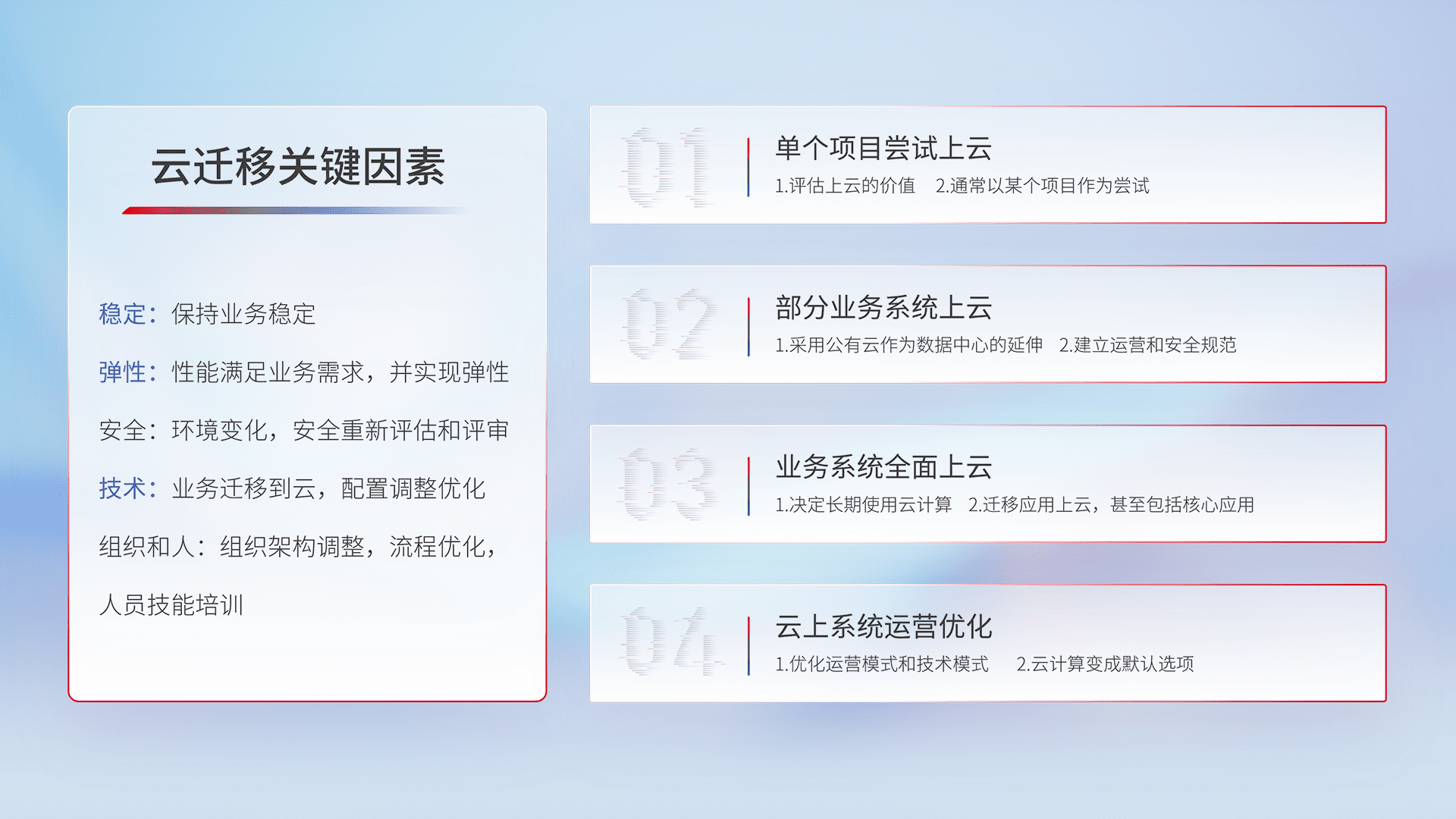 结合实际业务,,从规划设计、、云平台选型、、、云原生改造、、、、数据迁移、、、、集成交付,,迁移全过程为客户识别最佳上云路径,,,,做好风险识别管理,,,设计网络架构、、、、身份权限、、、、安全审计合规、、、、操作审计、、、日志审计、、、、监控告警策略、、多站点容灾设计等,,对云上基础设施进行整体规划,,,,提升IT治理水平,,以满足弹性、、、、高可用、、、、高性能的需求。。。。