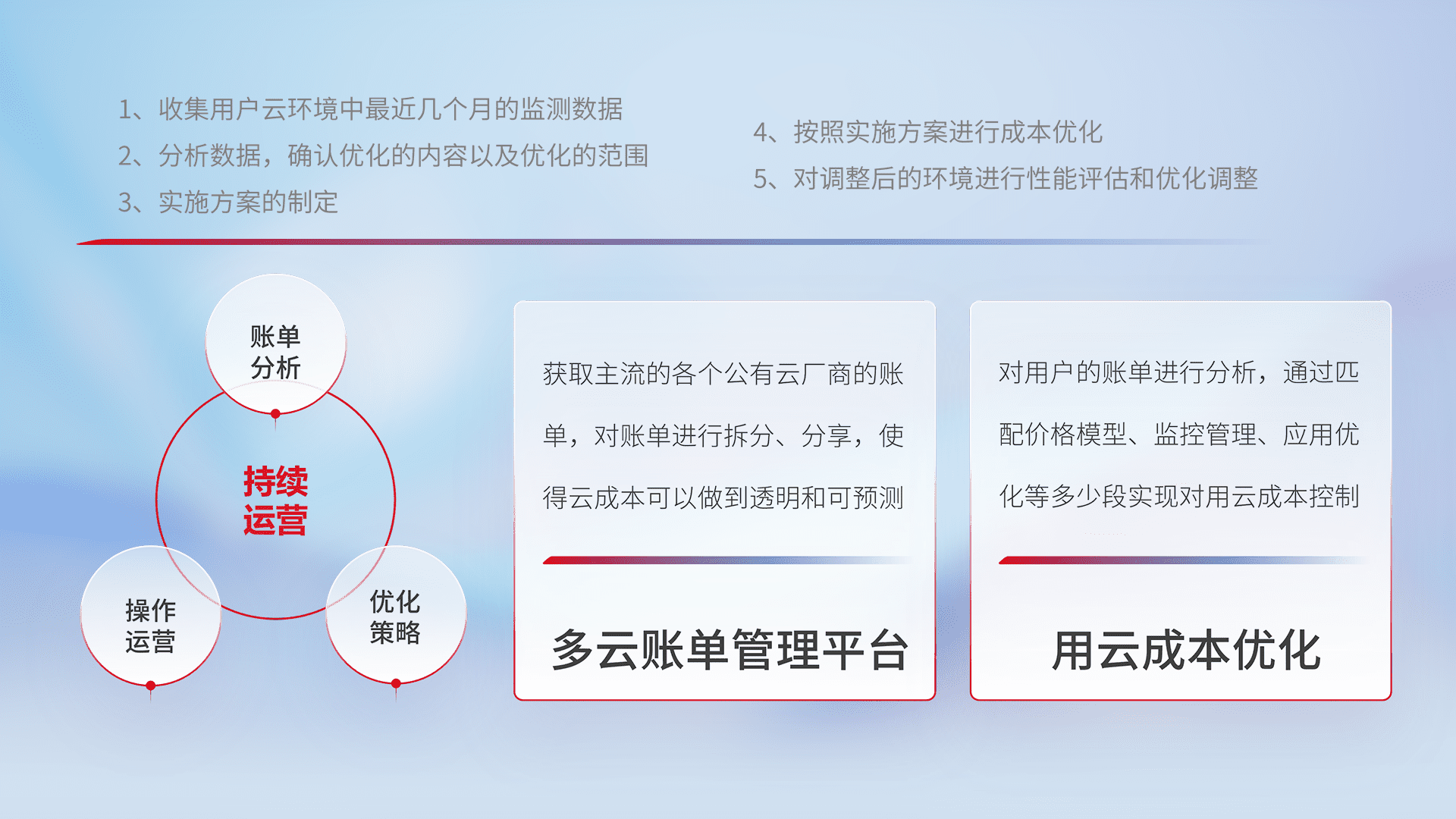 通过多云纳管,,以统一的资源数据模型把客户的云资源进行抽象和封装,,,进而实现对多云资源的统一操作,,保障云资源管理的可靠性、、、、稳定性与可用性。。。量身定制化运维内容,,,,配置、、开发运维、、、、补丁管理、、、、备份、、、、监控、、认证和访问管理、、审计和日常巡检等,,,,保障在用云过程中的可靠度,,,,稳定度以及高可用率。。